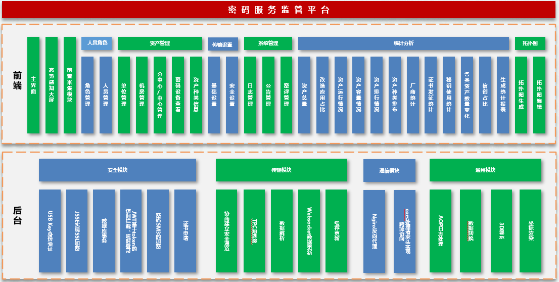 密码服务监管平台部署于指定的设备管理中心单位,可以是国家级、省级或市级,用于监测下属多个中心或机房中的密码设备。