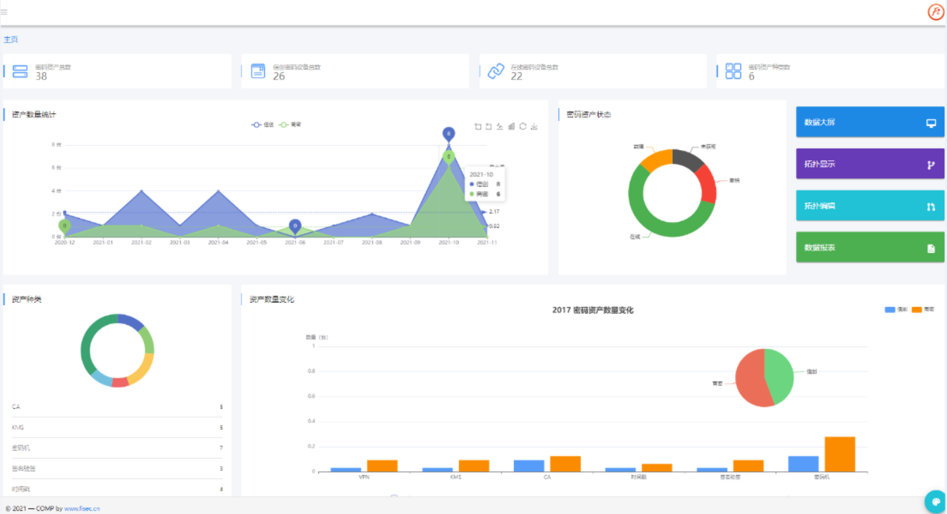 给予行业态势感知和设备运行态势感知内容呈现。行业态势感知包含资产概况、资产数排行、资产类型、各地区密码资产分布、各类资产改造应用等,设备运行态势感知包含设备总台数、资产在线比例、设备在线时长统计、设备分类信息统计、证书发放量、密钥使用量等统计。